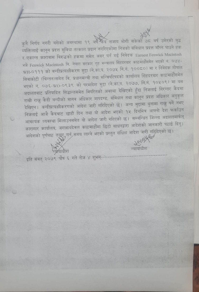 शोभराजले १९ वर्ष आफू कैदमा बसिसकेको र उमेर ७८ वर्ष भइसकेको भन्दै रिहा गर्न भन्दै सर्वोच्चमा निवेदन दिएका थिए । सोही निवेदनमाथि सुनुवाइ गर्दै सर्वोच्चका न्यायाधीश सपना प्रधान मल्ल र तिलप्रसाद श्रेष्ठको संयुक्त इजलासले आजै रिहा गर्न आदेश दिएको हो ।