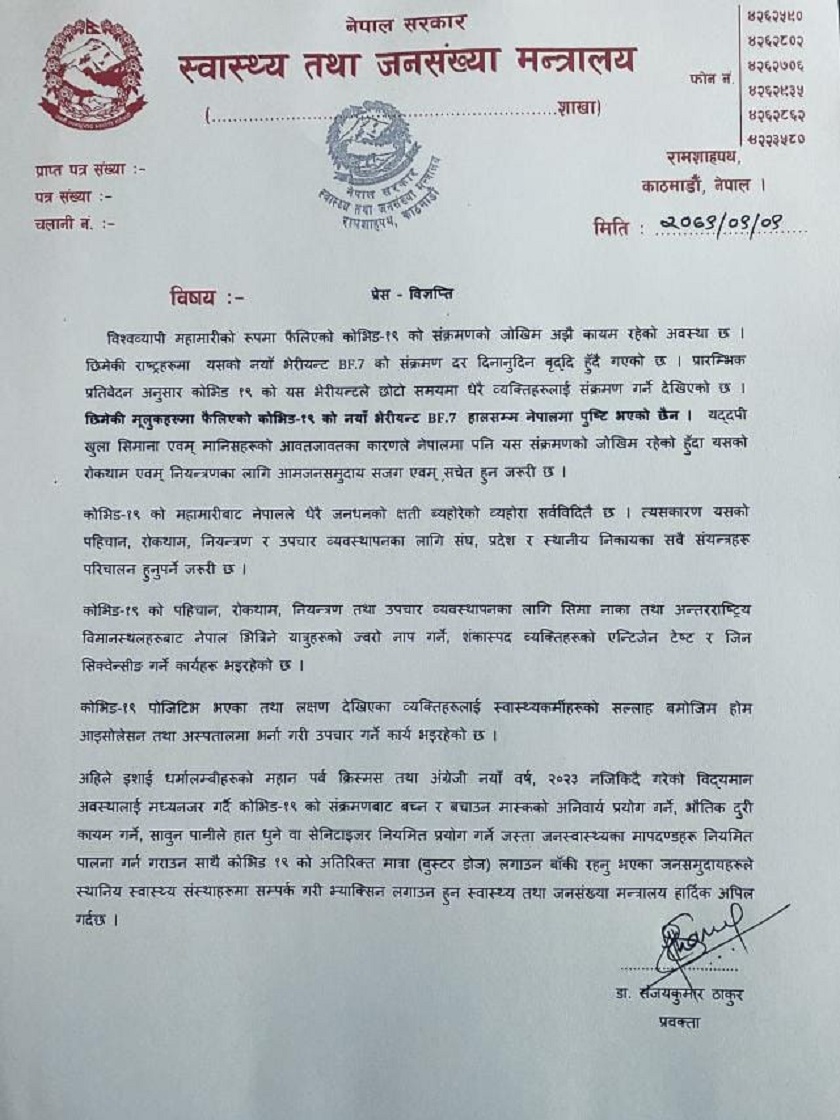 शनिबार एक विज्ञप्ति जारी गर्दै मन्त्रालयले भनेको छ, ‘ छिमेकी राष्ट्रहरूमा कोभिड-१९ को नयाँ भेरियन्टको संक्रमण दर दिनानुदिन वृद्धि हुँदै गएको छ । तर, नयाँ भेरियन्ट हालसम्म पुष्टि भएको छैन । यद्यपि, खुला सीमाना एवं आवतजावतका कारण नेपालमा पनि संक्रमणको जोखिम रहेको हुँदा यसको रोकथाम एवं नियन्त्रणका लागि आम जनसमुदाय सजग एवं सचेत हुन जरुरी छ ।’