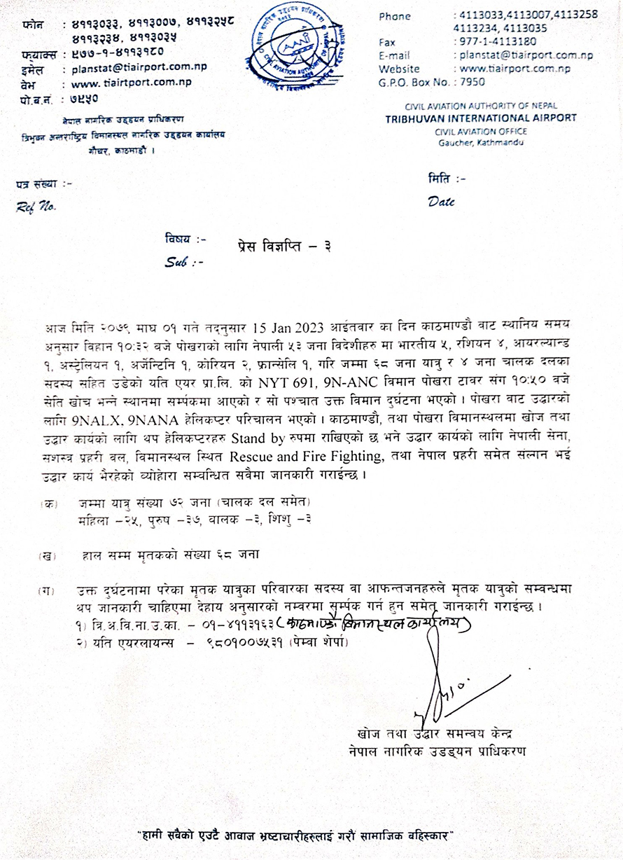 विमान दुर्घटनामा ६८ जनाको मृत्यु भएको पुष्टि