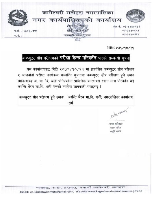 काठमाडौं, फागुन १- काठमाडौंको कागेश्वरी मनोहरा नगरपालिकाले सहायक कम्प्युटर अपरेटर पदका उम्मेदवारहरुको सिप परिक्षण र अन्तर्वार्ताका लागि परिक्षा केन्द्र परिवर्तन गरेको छ । नगरपालिकाले आइतबार एक सूचना जारी गर्दै परिक्षा केन्द्र परिवर्तन गरिएको जनाएको हो ।