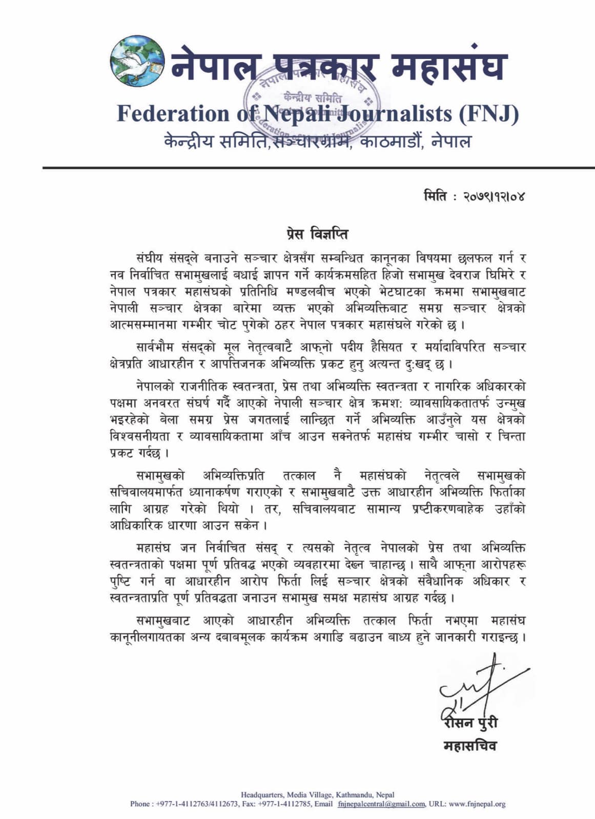 महासंघको प्रतिनिधि मण्डलबीच भएको भेटघाटका क्रममा सभामुखबाट नेपाली सञ्चार क्षेत्रका बारेमा व्यक्त भएको अभिव्यक्ति पदीय हैसियत र मर्यादाविपरित रहेको नेपाल पत्रकार महासंघले ठहर गरेको छ । संघीय संसद्ले बनाउने सञ्चार क्षेत्रसँग सम्बन्धित कानुनका विषयमा छलफल गर्न र नव निर्वाचित सभामुखलाई बधाई ज्ञापन गर्ने कार्यक्रममा सभामुखबाट नेपाली सञ्चार क्षेत्रका बारेमा व्यक्त भएको अभिव्यक्तिबाट समग्र सञ्चार क्षेत्रको आत्मसम्मानमा गम्भीर चोट पुगेको महासंघले बताएको हो ।