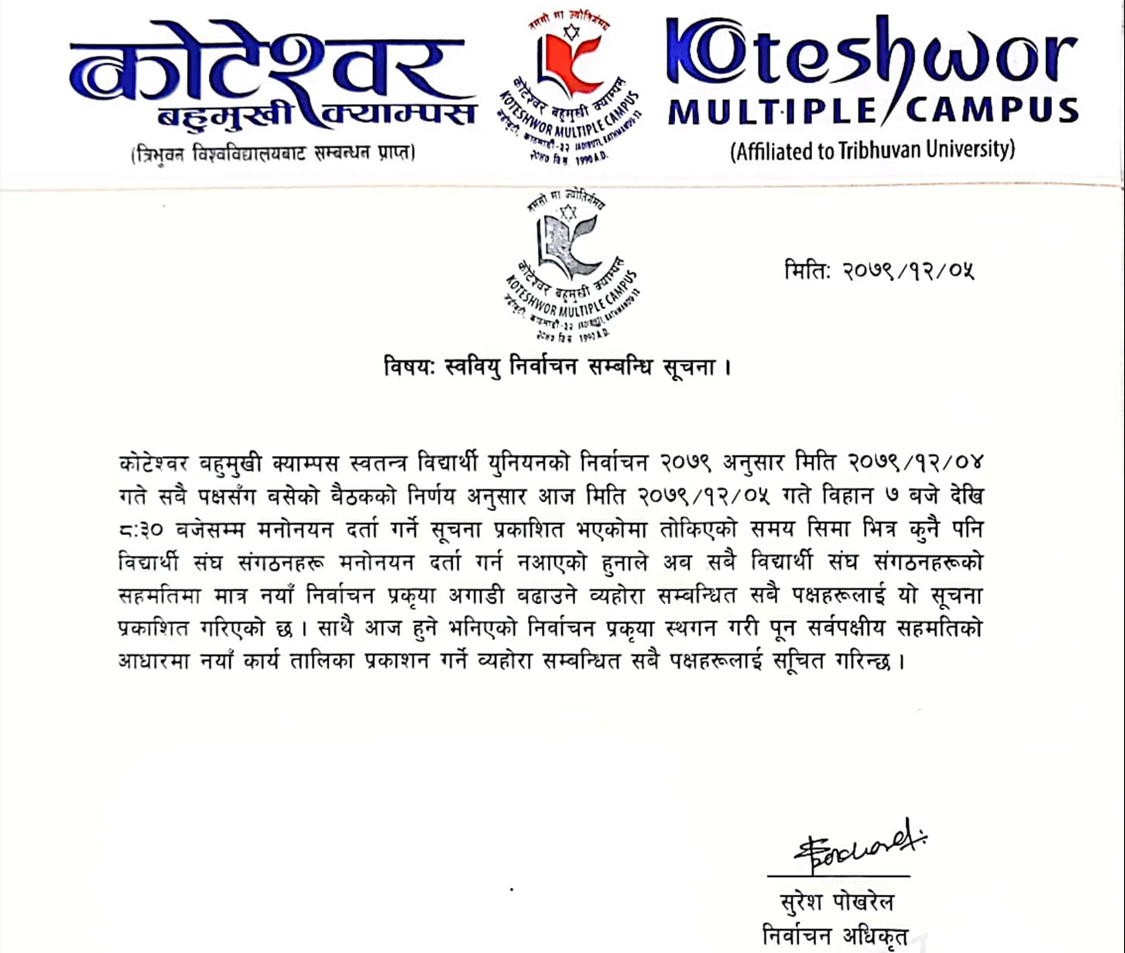 काठमाडौं, चैत ५- त्रिभुवन विश्वविद्यालयका अधिकांश क्याम्पसहरुमा आज स्ववियु निर्वाचन भइरहेको छ । तर काठमाडौंको जडीबुटीमा रहेको कोटेश्वोर बहुमुखी क्याम्पसमा भने क्याम्पस प्रशासनले बिद्यार्थी संघ संगठनहरुलाई मनोनयन दर्ताका लागि आह्वान गर्दा समेत बिद्यार्थी संगठनहरु मनोनयन दर्ताका लागि नआएको भन्दै क्याम्पस प्राशासनाले सुचना निकालेको छ ।