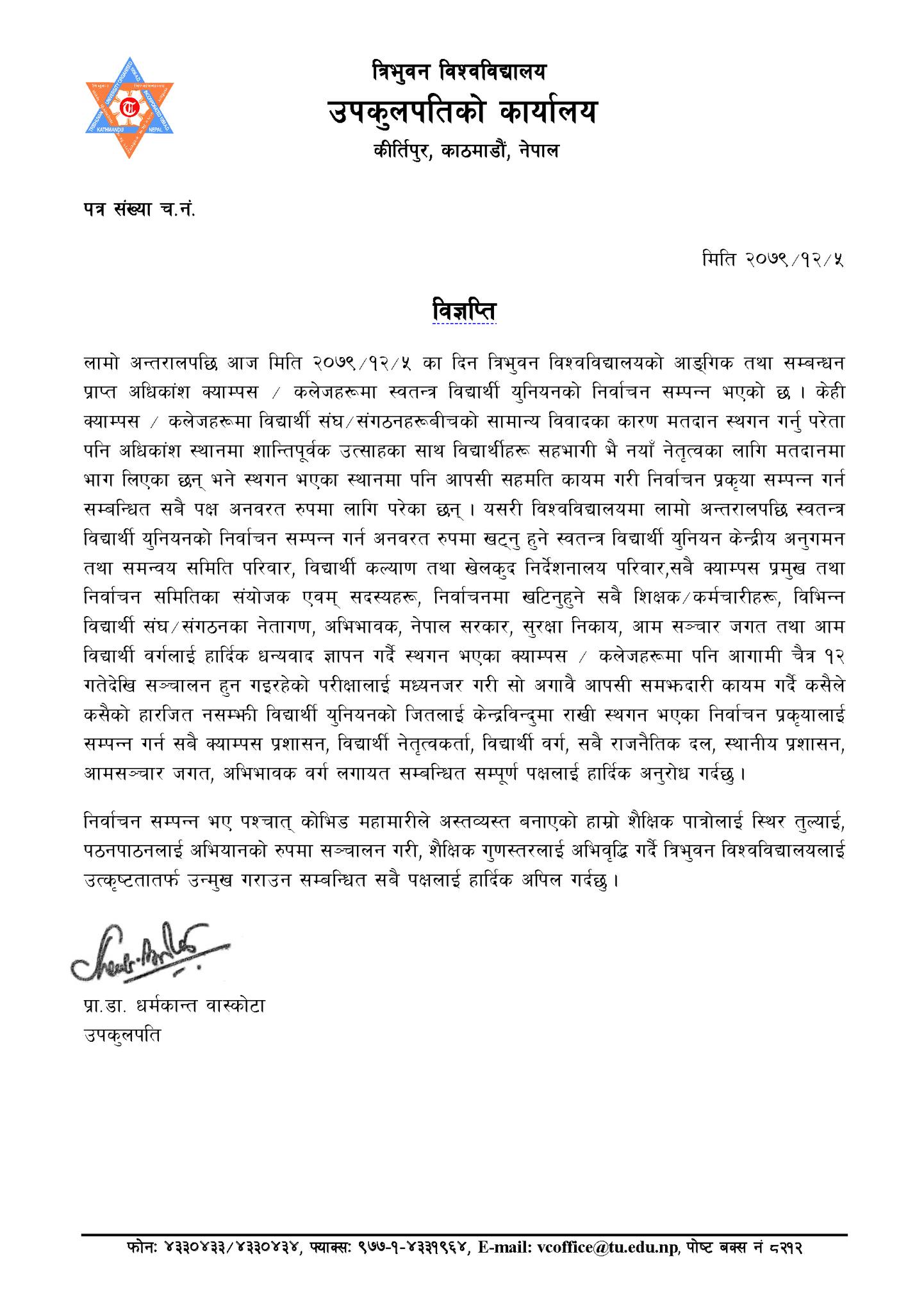 उपकुलपति बास्कोटाले चैत १२ गतेदेखि परीक्षाहरू सञ्चालन हुने भएकोले त्यसअघि नै रोकिएका क्याम्पसमा स्ववियु चुनाव सक्न आग्रह गरेका हुन्।