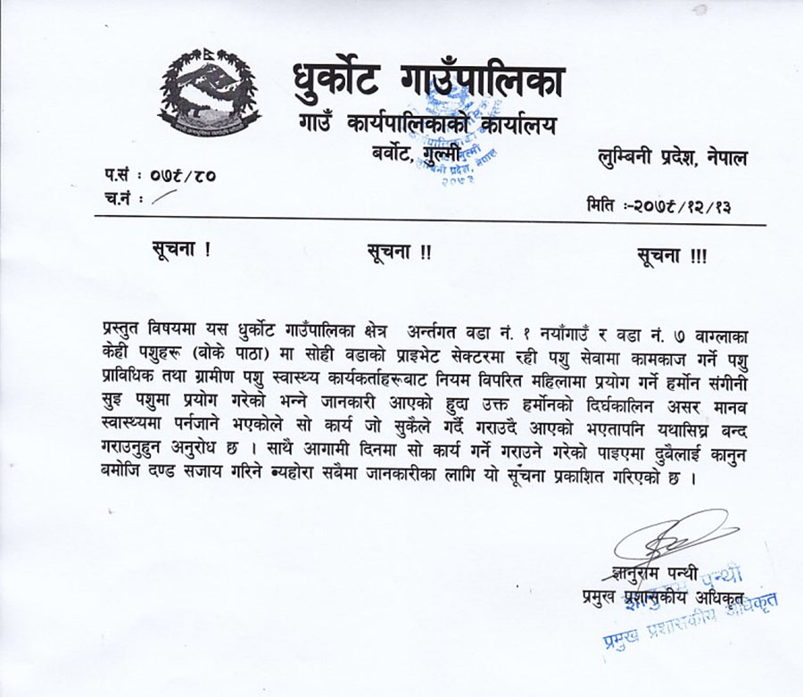 आगामी दिनमा यस्तो कार्य गर्ने गराउने गरेको पाइएमा कानुन बमोजि सजाय दिने भन्दै संगिनी सुइ लगाउन तत्काल रोक्न सूचना जारी गरेको गाउँपालिकाले जारी गरेको सूचनामा उल्लेख छ ।
