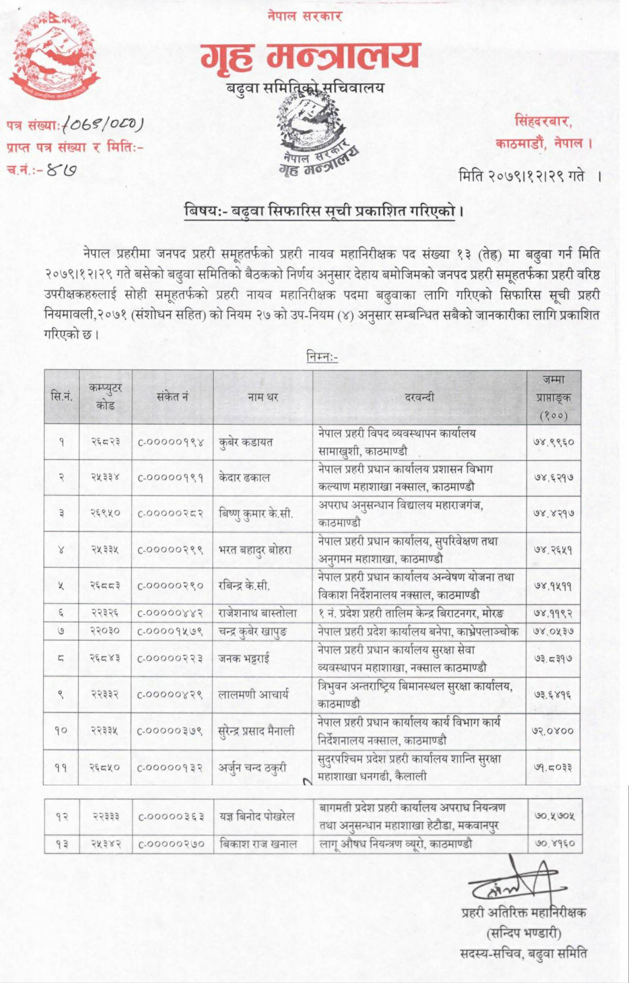 गृह मन्त्रालयले समितिको सिफारिसअनुसार बढुवा सिफारिस सूची प्रकाशित गरेको छ । प्रहरी नियमावली, २०७१ (संशोधनसहित) को नियम २७ को उपनियम (४) अनुसार मन्त्रालयले बढुवा सिफारिस सूची प्रकाशित गरेको बढुवा समितिका सदस्य सचिव प्रहरी अतिरिक्त महानिरीक्षक सन्दीप भण्डारीले जानकारी दिए ।