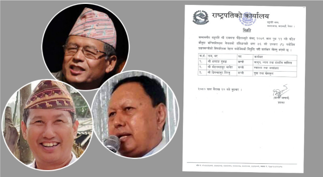काठमाडौं, बैशाख २०- प्रधानमन्त्री पुष्पकमल दाहालले फेरि मन्त्रिपरिषद् विस्तार गरेका छन् । प्रधानमन्त्री दाहालको सिफारिसमा राष्ट्रपति रामचन्द्र पौडेलले संविधानको धारा ७६ को उपधारा (९) बमोजिम बुधबार तीन मन्त्रीहरु नियुक्त गरी कार्यभार तोकेका हुन् ।