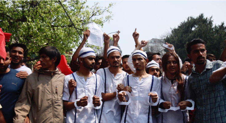 काठमाडौंको त्रिचन्द्र क्याम्पसमा नेविसंघको एक समूहले ‘सभापति ज्यु खाँणलाई किन निलम्बन नगरेको ?’ लेखिएको प्लेकार्डसहित प्रदर्शन गरेको हो ।
