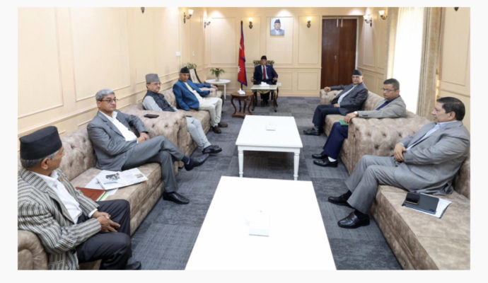प्रतिनिधिसभामा देखिएको गतिरोध अन्त्यका लागि शनिबार बिहान तीन दलका शीर्ष नेता छलफलका जुटेका हुन् । छलफलमा प्रधानमन्त्री पुष्पकमल दाहाल, कांग्रेस सभापति शेरबहादुर देउवा र एमाले अध्यक्ष केपी शर्मा ओलीलगायतका शीर्ष नेता रहेका थिए । बैठकमा गृहमन्त्रीसमेत रहेका माओवादीका वरिष्ठ उपाध्यक्ष नारायणकाजी श्रेष्ठ, उपप्रधान तथा रक्षामन्त्री पूर्णबहादुर खड्का पनि सहभागी थिए । त्यस्तै कांग्रेस, एमाले र माओवादीका प्रमुख सचेतकहरू रमेश लेखक, पदम गिरी र हितराज पाण्डे पनि बैठकमा सहभागी थिए ।
