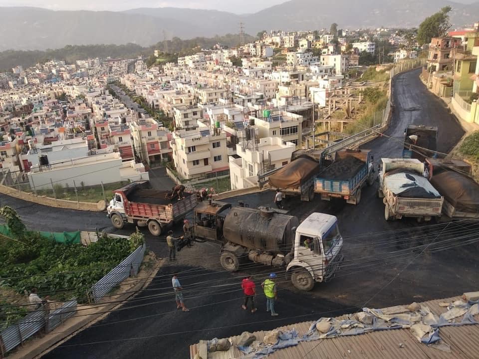 वडाको ‘ग्रिनहिल सिटि गेटदेखि अर्याल गाउँसम्मको सडक अबेर राती १२ बजे मात्र कालोपत्रे गर्ने काम सम्पन्न भएको छ । उक्त सडक कालोपत्रे गर्ने काम सम्पन्न नहुन्जेलसम्म वडाअध्यक्ष प्रकाश फुयालसहित वडासदस्य कपिल खनाल, विकास केसीलगायतको टोली रातको १२ बजेसम्म कार्यस्थलमै बसेर अनुगमन गर्दै कामदारसँगै खटिएका थिए ।