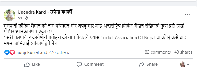 शनिबार फेसबुकमा स्टाटस लेख्दै उनले मूलपानी क्रिकेट मैदानको नाम परिवर्तन गरी जयकुमार अन्तर्राष्ट्रिय क्रिकेट मैदान राखिएकोप्रति ध्यानाकर्षण भएको जनाएका हुन्। उनले भनेका छन्, ‘यसरी मूलपानी र कागेश्वरी मनोहराको नाम मेटाउने प्रयास क्रिकेट एसोसिएसन अफ नेपाल वा कोही कसैबाट भए हामीलाई स्वीकार्य हुने छैन।’