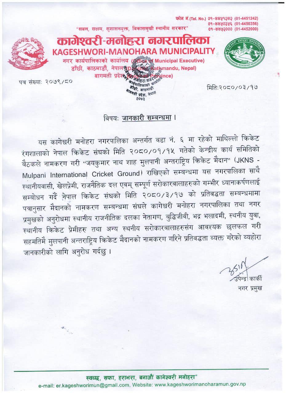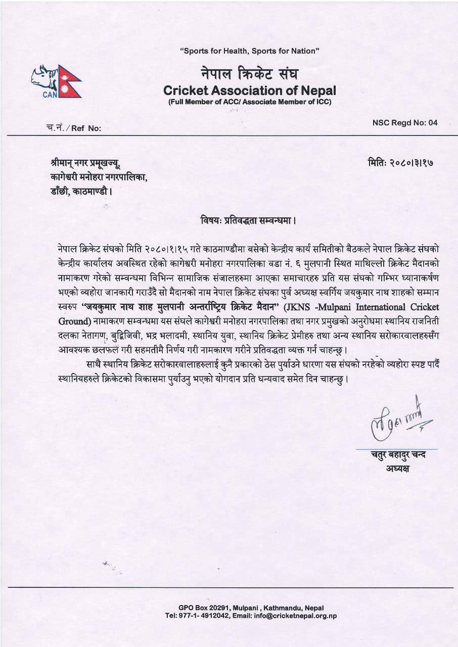 क्यानका संस्थापक तथा पूर्व अध्यक्ष जयकुमार नाथ शाहको सम्मानमा मुलपानी क्रिकेट मैदानको नाम परिवर्तन गरेर उनको नाममा नामाकरण गरेको बताएको थियो ।