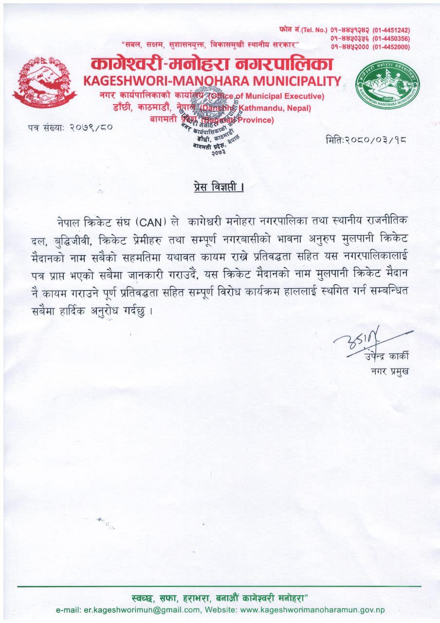 सोमबार कागेश्वोरी मनोहरा नगरपालिकाका नगरप्रमुख उपेन्द्र कार्कीले प्रेस विज्ञप्ति जारी गर्दै मुलपानी अन्तर्राष्ट्रिय क्रिकेट मैदानको नाम यथावत रहने पत्र नगरपालिकालाई प्राप्त भएको जानकारी गराएका हुन् ।