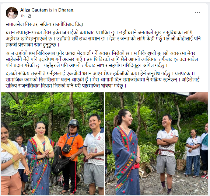 उनले थपेकी छन्, ‘दलको सक्रिय राजनीति गर्नेहरूलाई एकचोटी धरान आएर मेयर हर्कजीको काम हेर्न अनुरोध गर्दछु । यसपटक म सामाजिक कामको सिलसिलामा धरान आएकी हुँ । मेरा आगामी दिन समाजसेवामा नै सक्रिय रहनेछन् । अहिलेलाई सक्रिय राजनीतिबाट विश्राम लिएको पनि यसै पोष्टमार्फत घोषणा गर्दछु ।’
