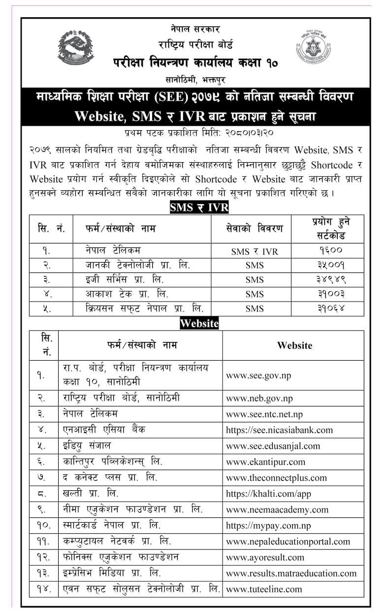 एसइईको नतिजा परीक्षार्थीले बोर्डको वेबसाइटका साथै एसएमएस र आइभीआरबाट पनि हेर्न सकिने व्यवस्था गरेको छ।