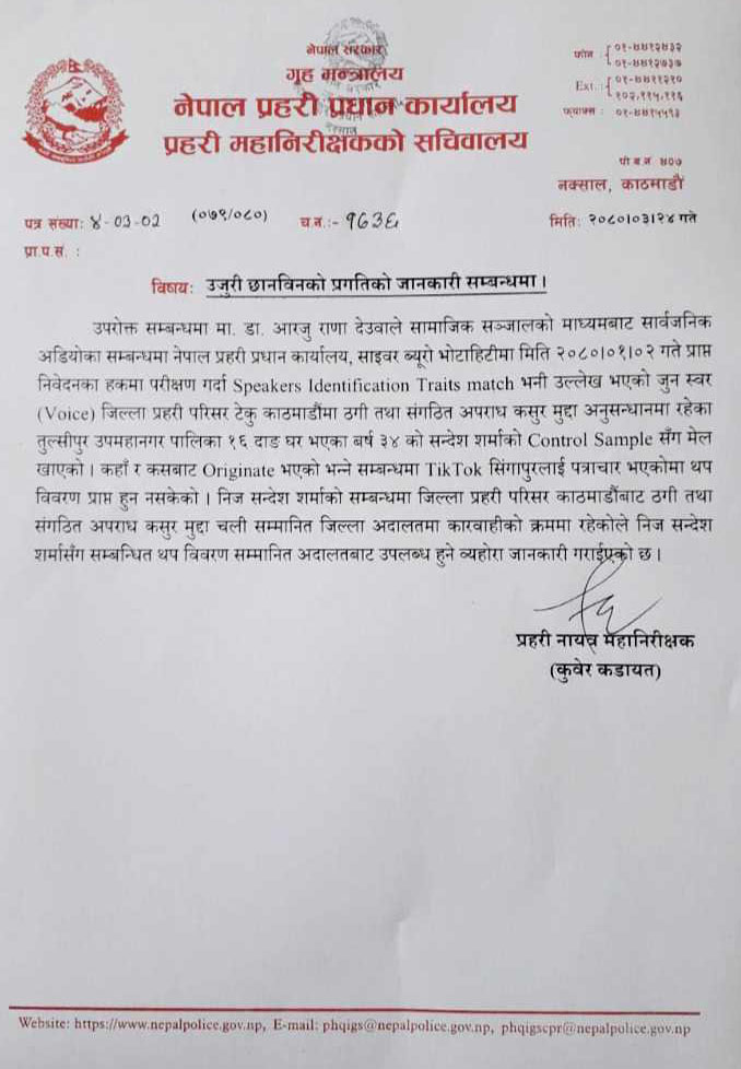 राणाले आफ्नो नाम जोडेर फेक अडियो सार्वजनिक भएको भन्दै छानबिन गरी दोषीलाई कारबाही गर्न माग राखेर नेपाल प्रहरीको साइबर ब्यूरोमा निवेदन दिएकी छिन् ।