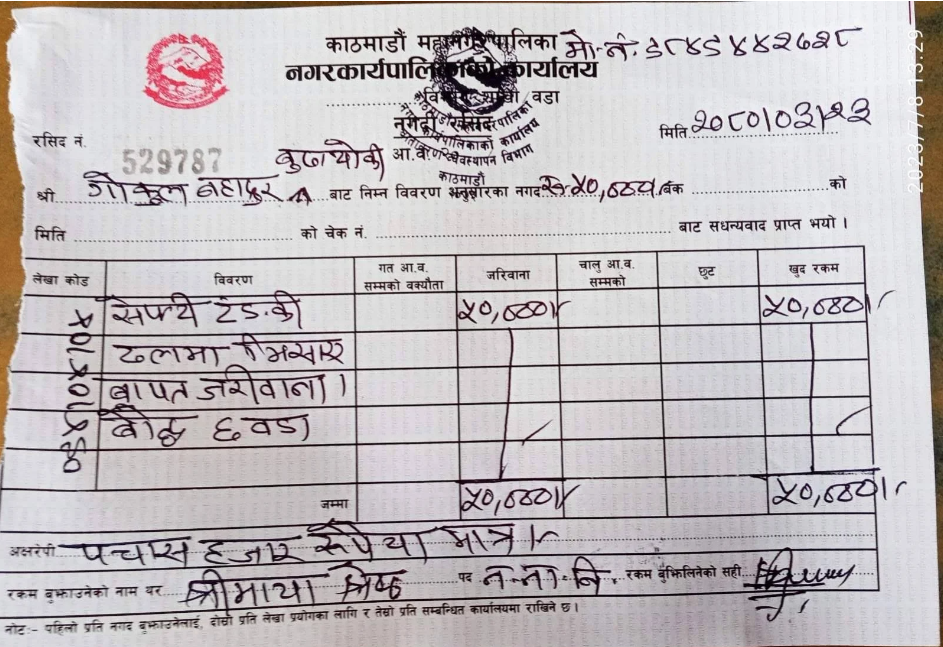 काठमाडौँ महानगरपालिका वडा नं.६ बौद्ध निवासी गोकुल बहादुर बुढाथोकीलाई सेफ्टि ट्याङ्की ढलमा मिसाएको आरोपमा पचास हजार जरिवाना गरिएको हो ।