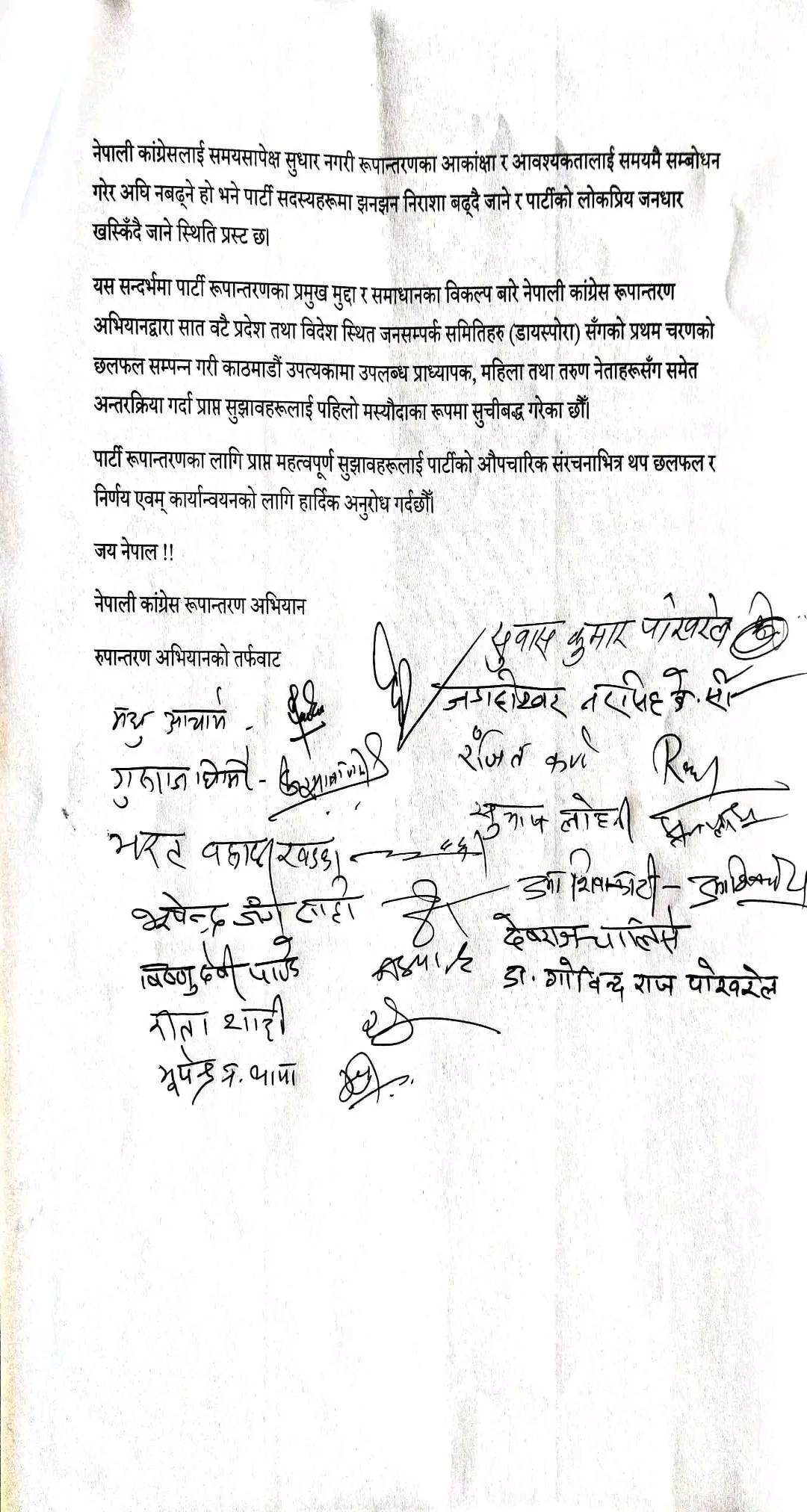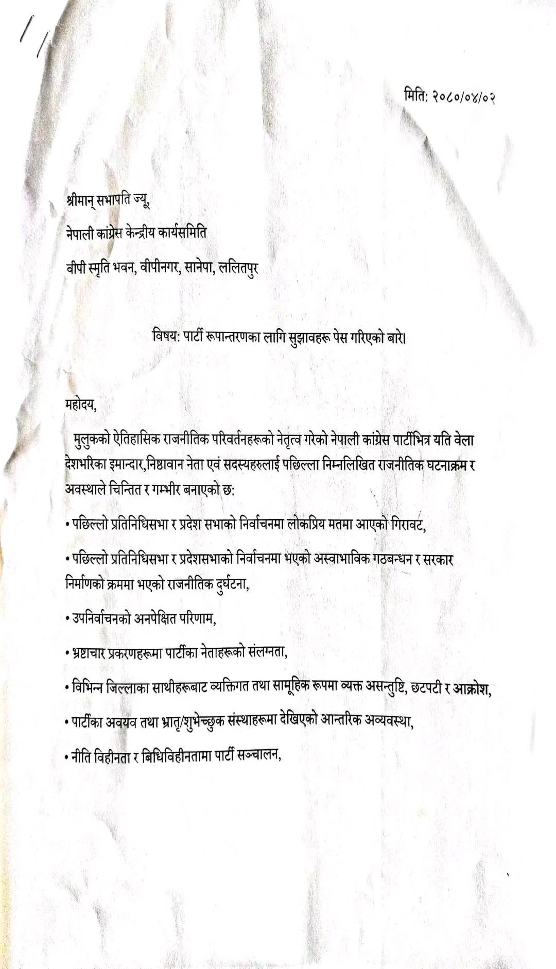 काठमाडौं, साउन २- नेपाली कांग्रेस रूपान्तरण अभियानले पार्टी कार्यालयमा सुझाव बुझाएको छ । प्रतिवेदन बुझ्न पार्टी सभापति शेरबहादुर देउवाले अस्वीकार गरेपछि सातै प्रदेश र विदेशस्थित जनसम्पर्क समितिहरूसँगको छलफल पछि प्राप्त सुझावहरूलाई सूचीबद्ध गरी पार्टी कार्यालयमा बुझाएको हो ।