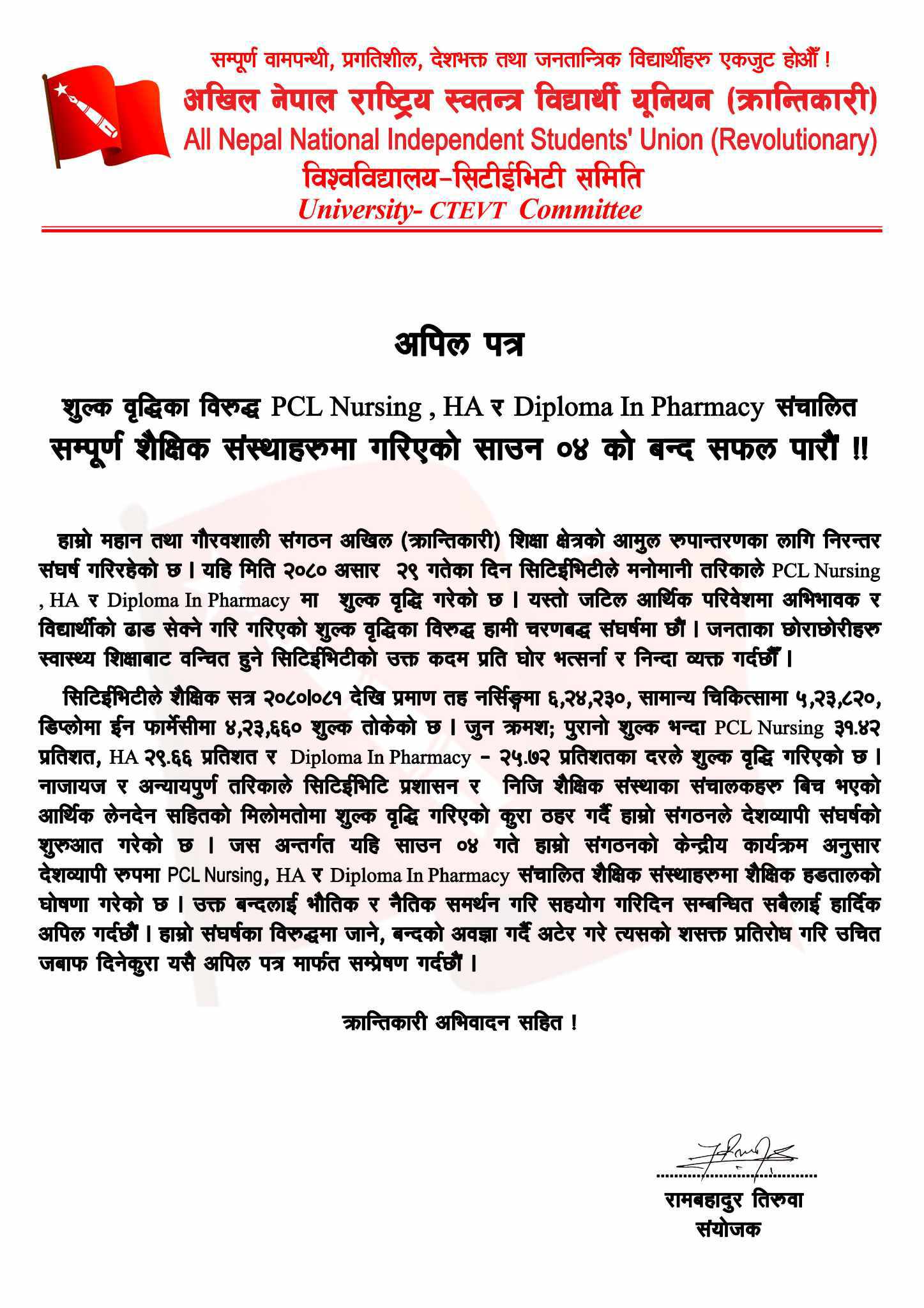 अपिल पत्रमा भनिएको छ, ” यहि मिति २०८० असार २९ गतेका दिन सीटीईभीटीले मनोमानी तरिकाले PCL Nursing, HA र Diploma In Pharmacy मा शुल्क बृद्दि गरेको छ । यस्तो जटिल आर्थिक परिवेशमा अभिभावक र बिद्यार्थीहरुको ढाड सक्ने गरि गरिएको शुल्क वृद्धिका विरुद्ध हामी चरणबद्ध संघर्षमा छौं । जनताका छोराछोरीहरु स्वास्थ्य शिक्षाबाट बन्चित हुने सीटीईभीटीको उक्त कदम प्रति घोर भत्सर्ना र निन्दा व्यक्त गर्दछौं ।