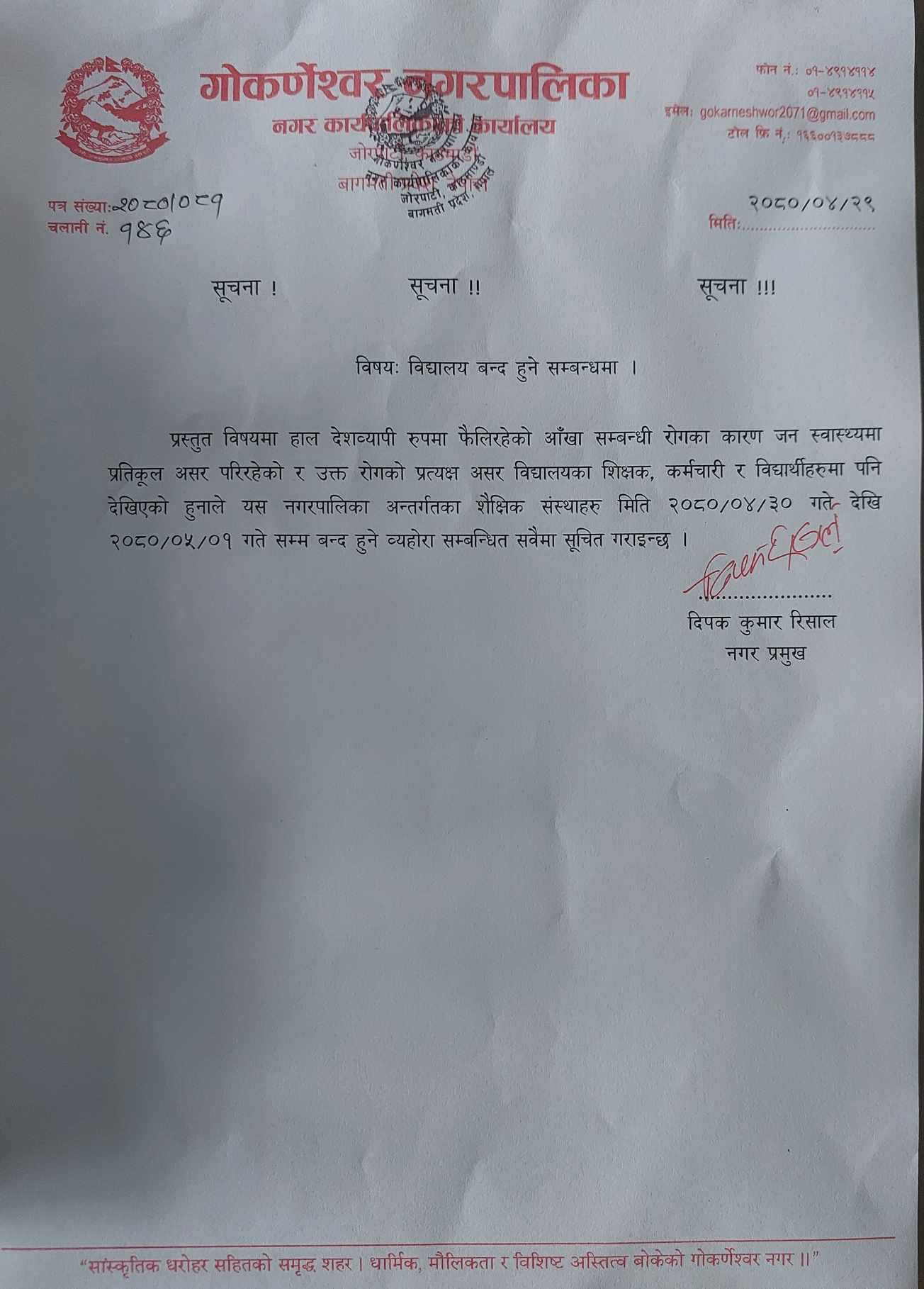 देशव्यापी रुपमा फैलिएको आँखा पाक्ने, रातो हुने जस्ता लक्षण भएका बिरामी बढेकाले विद्यालयहरु बन्द गरिएको नगरप्रमुख दिपक कुमार रिसालले हाम्रोसंचारलाई जानकारी दिए ।