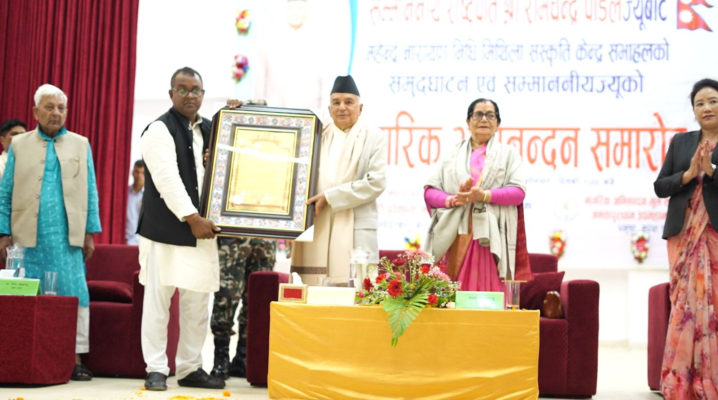 आज जनकपुरमा आयोजित नागरिक अभिनन्दन तथा महेन्द्रनारायण निधि मिथिला संस्कृति केन्द्रको उद्घाटन समारोहमा राष्ट्रपति पौडेलले राष्ट्रिय एकता र रूपान्तरणमा मधेसको सबल भूमिका रहँदै आएको भन्दैँ नेपालको राष्ट्रियताको चुरो पनि मधेसमै रहेको बताए ।
