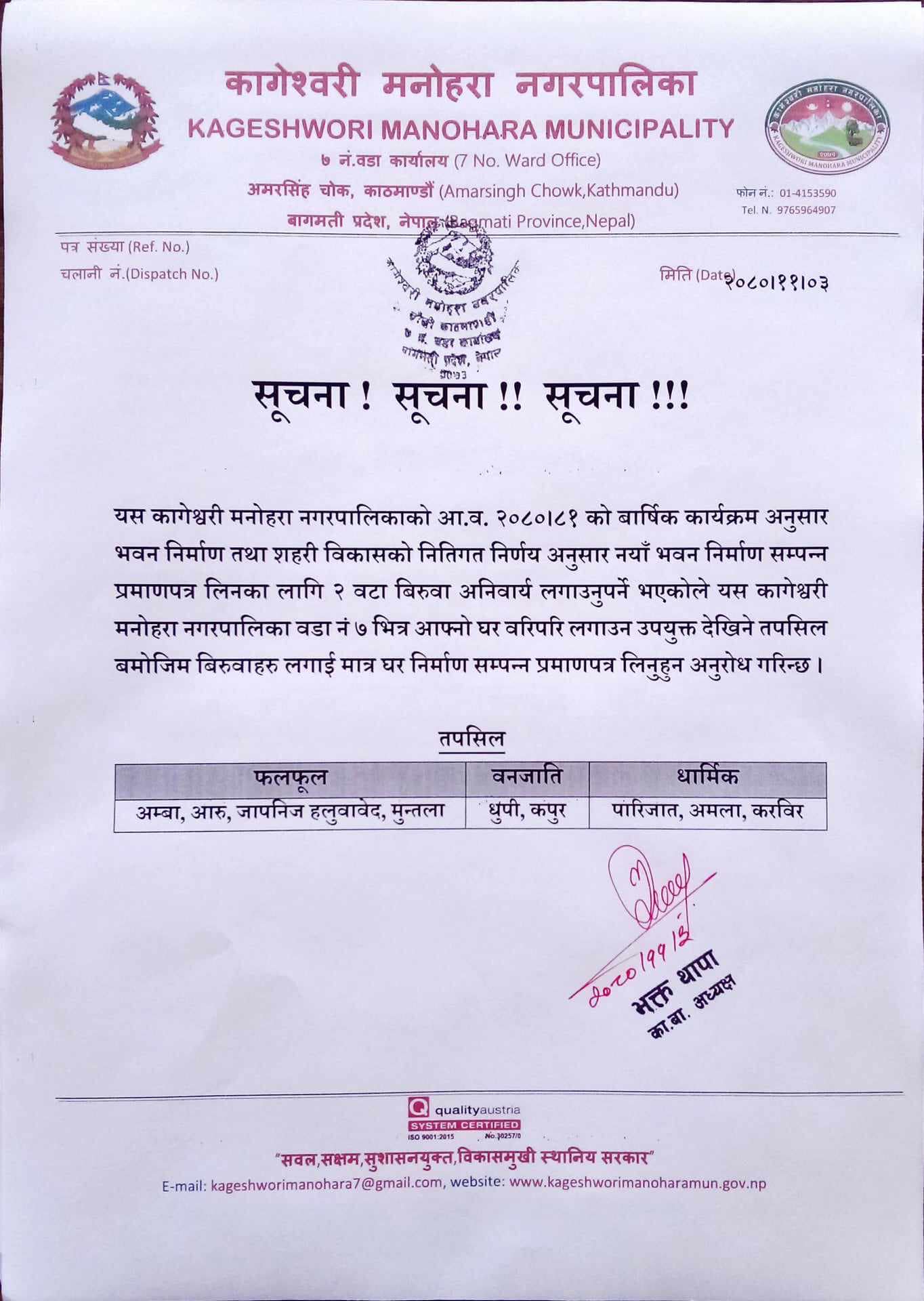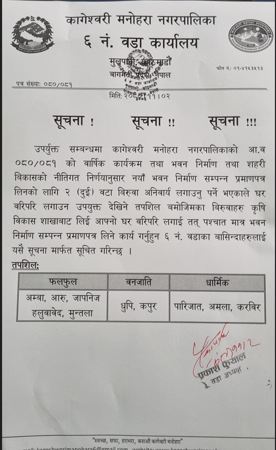 यीमध्ये कुनैपनि २ वटा जातका बिरुवा रोप्नुपर्नेछ । अन्यथा घर निर्माण सम्पन्नको प्रमाणपत्र जारी नहुने नगरपालिकाद्धारा जारी सुचनामा बताइएको छ ।