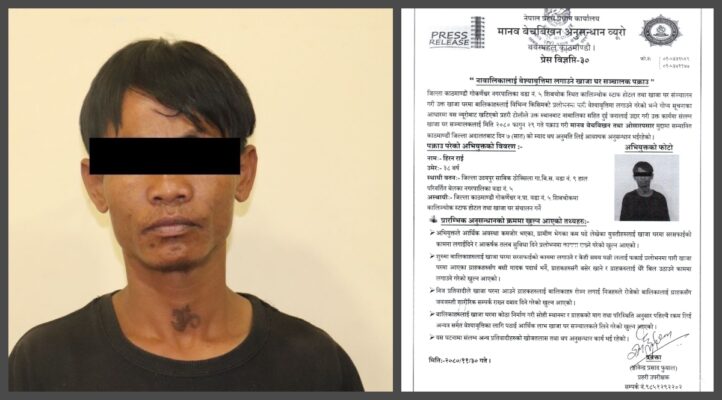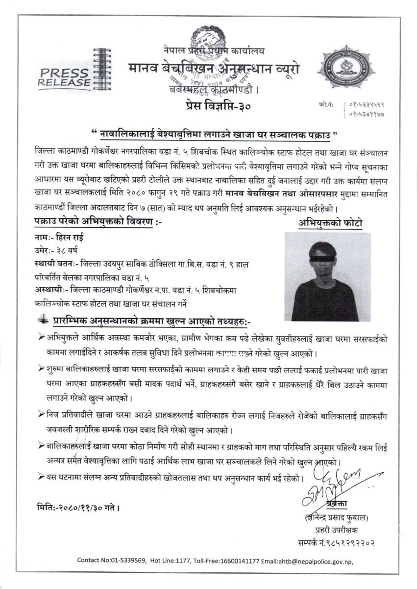 पक्राउ पर्नेमा उदयपुर जिल्ला घर भई हाल काठमाडौं बस्ने ३८ वर्षीय हिरन राई रहेका छन् । उनलाई बुधबार मानव बेचबिखन तथा ओसारपसार ब्युरोले पक्राउ गरेको हो । ब्युरो प्रवक्ता प्रहरी उपरीक्षक ज्ञानेन्द्र फुयाँलका अनुसार गोकर्णेश्वर नगरपालिका-५ शिवचोकमा उनले कालिञ्चोक स्टाफ होटल तथा खाजा घर सञ्चालन गरिरहेका थिए ।