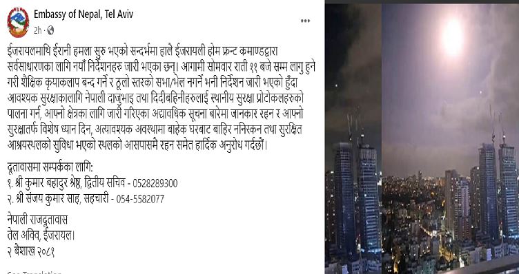 काठमाडौँ, वैशाख २- इजरायलमाथि इरानी हमलापछि इजरायलको तेलअभिवस्थित नेपाली राजदूतावासले आज अत्यावश्यक अवस्थामा बाहेक घरबाट बाहिर ननिस्कन त्यहाँ रहेका नेपालीहरुलाई आग्रह गरेको छ ।