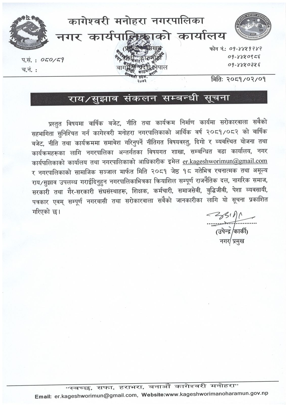 काठमाडौं, जेठ २- काठमाडौंको कागेश्वरी मनोहरा नगरपालिकाले आर्थिक बर्ष २०८१/८२ को लागि बजेट, निति तथा कार्यक्रम निर्माण कार्यको लागि राय र सुझाव मागेको छ ।