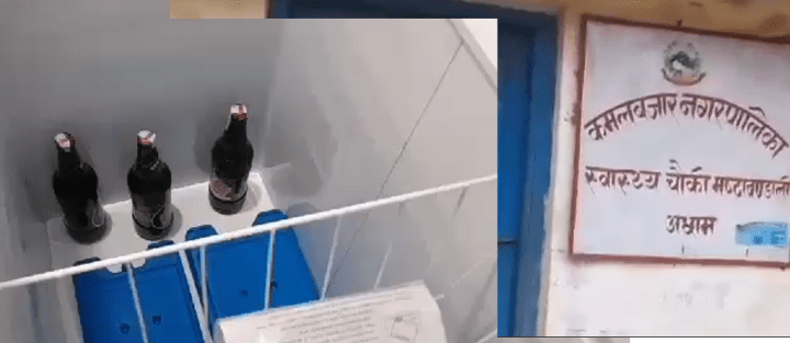 अछाम, जेठ ३२- अछामको एक स्वास्थ्य चौकीमा फ्रिज भित्र बियरको बोतल भेटिएको छ । जिल्लाको कमलबजार नगरपालिकाको एक स्वास्थ्य चौकीमा फ्रिज भित्र बियरको बोतल भेटिएको हो । उक्त भिडियो सामाजिक सञ्जालमा अहिले भाइरल नै बनेको छ ।