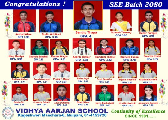 २०८० सालको एसईई परीक्षामा ३.७२ औषत उपलब्धि स्तर (जीपीए) नतिजा ल्याएर नगरकै सर्वोत्कृष्ट विद्यालय बनेको हो ।