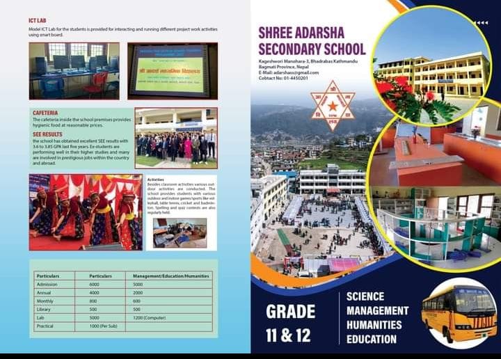 त्यो आबश्यकतालाई काठमाडौंको कागेश्वरी मनोहरा नगरपालिका वडा नम्बर ३ भद्रबासमा रहेको श्री आदर्श माध्यमिक विद्यालयले अविछिन्न पूरा गर्दै आएको छ। +२ तहको नतिजामा उत्कृष्ट रिजल्ट दिने बिद्यालयको सुचीमा नामांकित भएको यो विद्यालयले कक्षा ११ र १२ को पढाइलाई विगत वर्ष देखि नै विद्यालय तहको वातावरण र अब्बल नतिजा बनाउन सफल भएका छ। +२ पास गरेर कक्षा ११ मा भर्ना हुन चाहनेले Science, Management, humanities r education विषय लिएर अध्ययन गर्न पाईने र एसईईमा ल्याएको जीपीए भन्दा राम्रो जीपीए ल्याएर कक्षा १२ उत्तिर्ण गराउने गरेको यस आदर्श मावि रोज्दा सफलताको ऐतिहासिक मार्गलाई सफलतापूर्वक आफ्नो शैक्षिक गन्तव्यमा पुगेका उदाहरणहरु छन्।