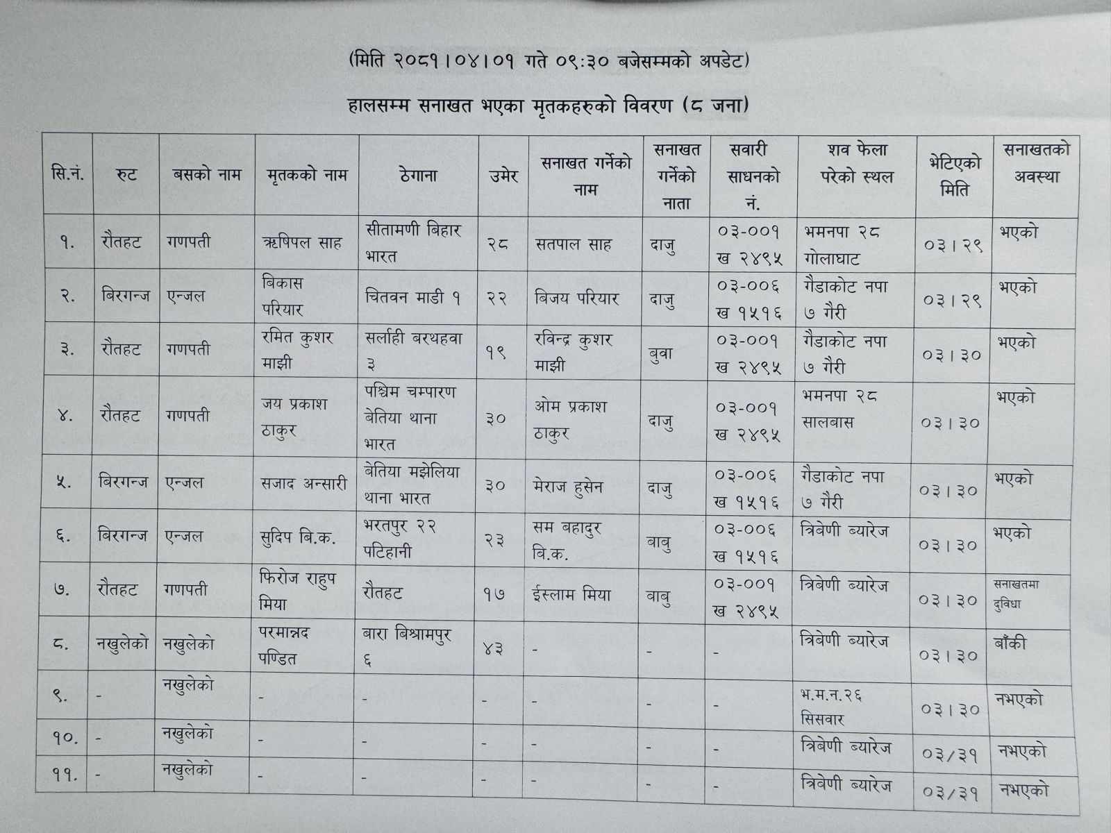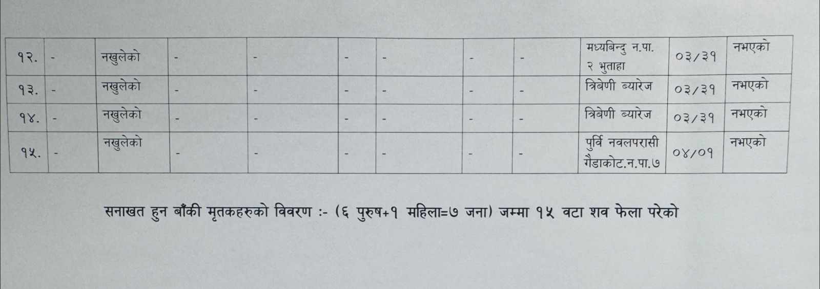 चितवन, साउन १- गत शुक्रबार बिहान पहिरोले बगाएर त्रिशूलीमा बेपत्ता भएका दुईवटा बसका यात्रुमध्ये १५ जनाको शव फेला परेको छ । भेटिएका शवमध्ये ८ जनाको परिचय खुलेको सशस्त्र प्रहरीले जानकारी दिएको छ ।