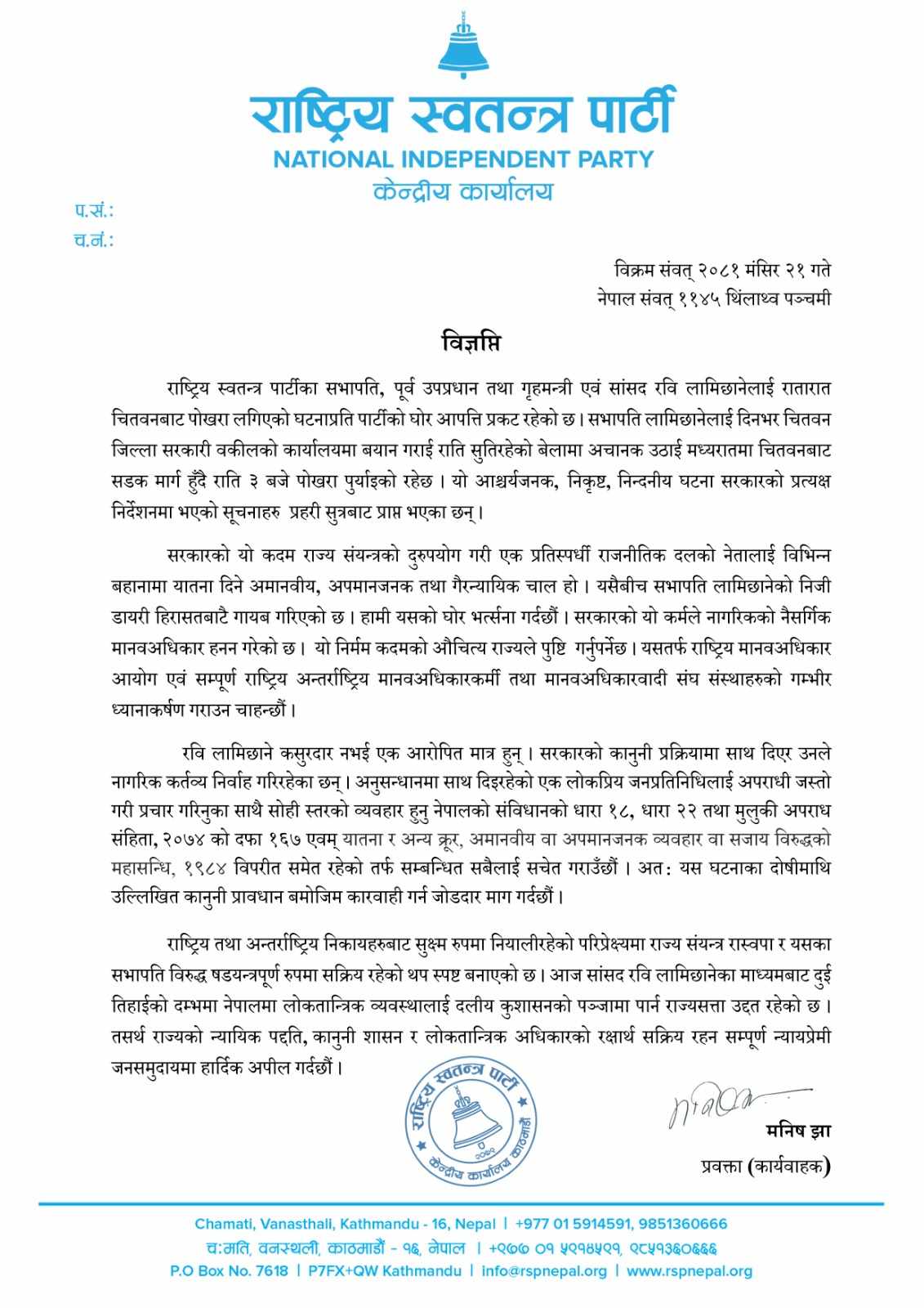काठमाडौं । सहकारी ठगीमा पक्राउ परेका आफ्ना सभापति रवि लामिछानेलाई चितवनबाट राति नै पोखरा लगिएको भन्दै राष्ट्रिय स्वतन्त्र पार्टीले आपत्ति जनाएको छ।