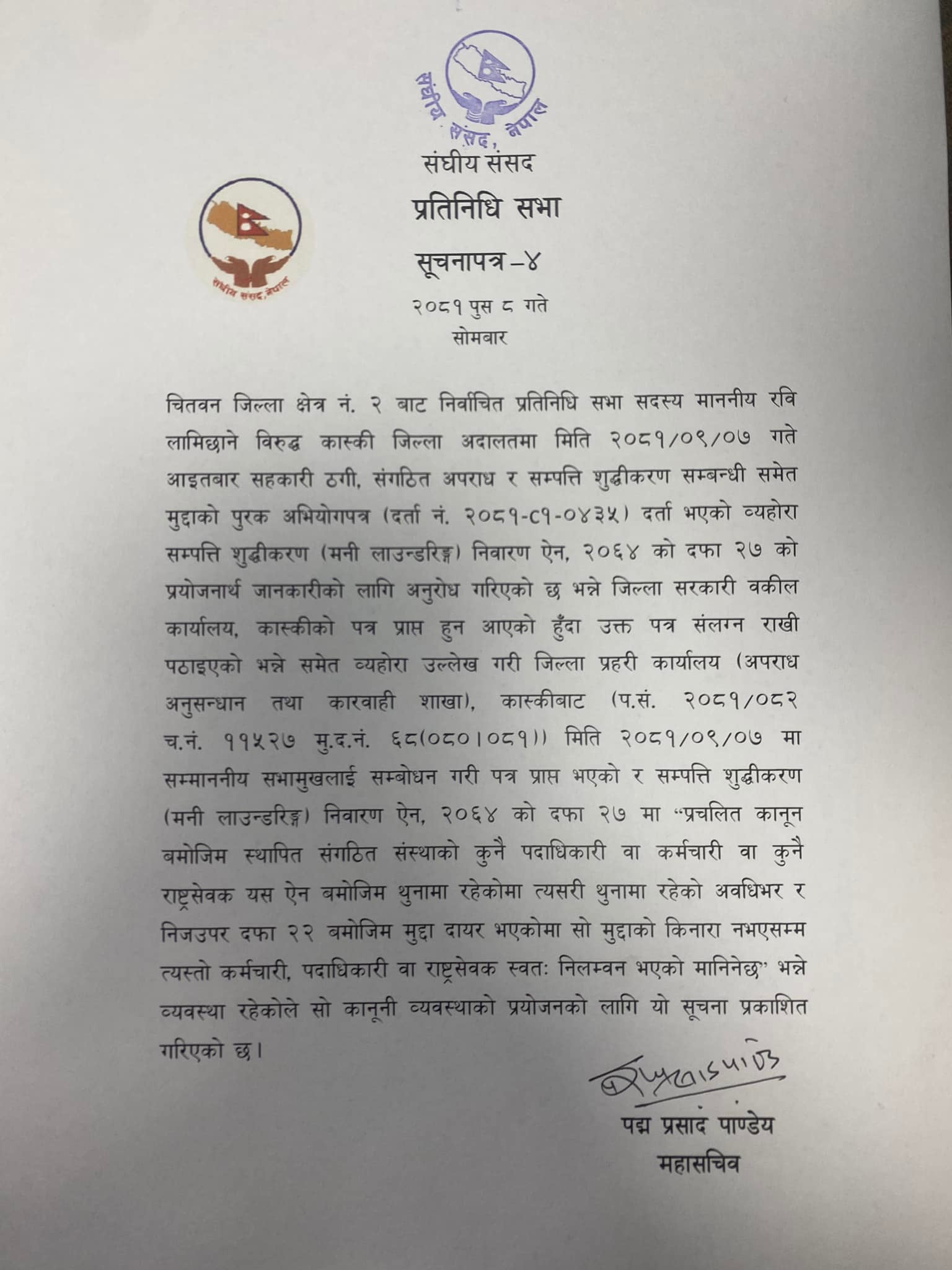 लामिछानेविरुद्ध सहकारी ठगी, संगठित अपराधसहित सम्पत्ति शुद्धीकरणमा पनि कास्की जिल्ला अदालतमा अभियोगपत्र दर्ता भएको जानकारीपत्र प्रहरीले सभामुख देवराज घिमिरेलाई आइतबार साँझ नै पत्र पठाएको थियो ।