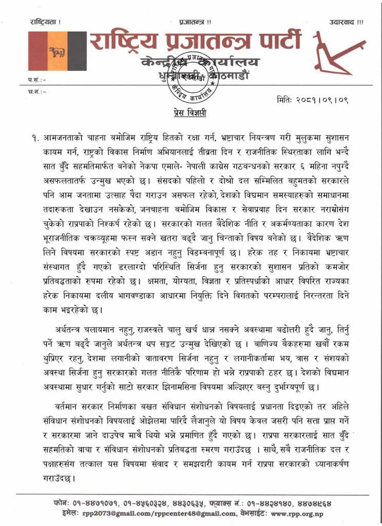 यसका साथै राप्रपाले सरकारलाई ७ बुँदे सहमतिको वाचा र संविधान संशोधनको प्रतिवद्धता स्मरण गराउँदै उक्त समझदारीप्रति गम्भीर हुन आग्रह गरेको छ।