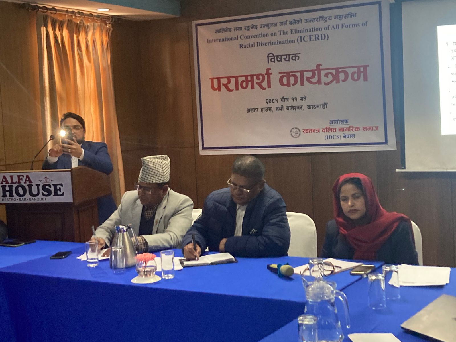 काठमाडौं, पुस ११- स्वतन्त्र दलित नागरिक समाजले जातिय भेदभाव तथा रंगभेद उन्मुलन गर्न बनेको अन्तर्राष्ट्रिय महासन्धिलाई नेपालले अनुमोदन गरेको ५४औं बर्ष पुरा हुन गैरहेको सन्दर्भमा परामर्श कार्यक्रम गरेको छ ।