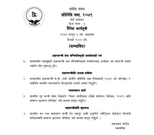 काठमाडौँ । सरकारले राष्ट्रिय सभाको अधिवेशन आह्वान गर्न राष्ट्रपति रामचन्द्र पौडेल समक्ष सिफारिस गरेको छ । सोमबार बसेको मन्त्रिपरिषद् बैठकले माघ ४ गते राष्ट्रिय सभाको अधिवेशन आह्वान गर्न राष्ट्रपति समक्ष सिफारिस गर्ने निर्णय गरेको सरकारका प्रवक्ता जगदीश खरेलले जानकारी दिए ।...