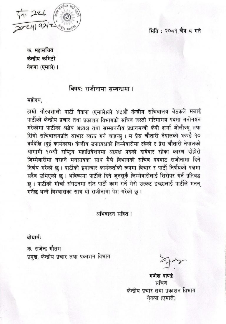 काठमाडौं । नेकपा एमाले केन्द्रीय प्रचार तथा प्रकाशन विभागका सचिव गणेश पाण्डेले राजीनामा दिएका छन् ।