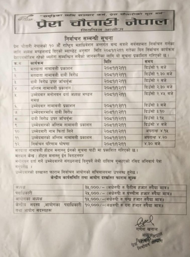 सूचना अनुसार दिउसो १ बजे पहिलो मतदाता नामाबली प्रकाशन भइ दावीविरोधपश्चात साढे २ बजे अन्तिम नामावली प्रकाशन गरिने छ । त्यसपछि पौने ३ बजे अध्यक्ष मण्डलसमक्ष उम्मेदवार मनोनयन दर्ता गर्ने समय तोकिएको छ।