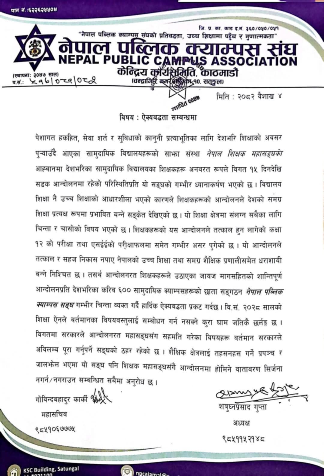 सरकारले बिगतमा आन्दोलनरत शिक्षक महासंङ्संग सहमति गरेका विषयहरु वर्तमान सरकारले पुरा गर्नु पर्ने पब्लिक क्याम्पस संघको ठहर छ ।