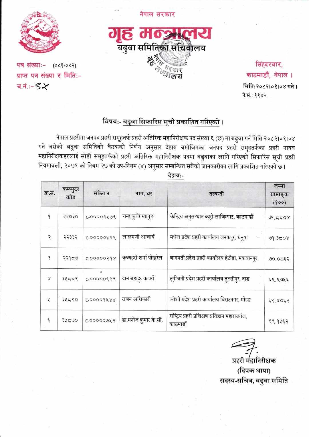 काठमाडौं । गृह मन्त्रालयले नेपाल प्रहरीका ६ जना प्रहरी नायब महानिरीक्षक (डीआईजी) लाई प्रहरी अतिरिक्त महानिरीक्षकमा बढुवा गर्न सिफारिस गरेको छ ।