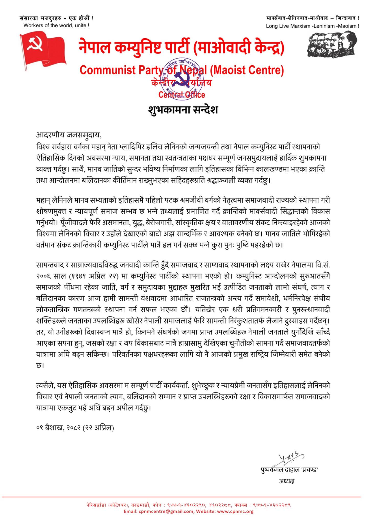 उनले मानव जातिले भोगिरहेको वर्तमान संकट क्रान्तिकारी कम्युनिस्ट पार्टीले मात्रै हल गर्न सक्ने दाबी गरेका छन्। ‘पुँजीवादले फेरि असमानता, युद्ध, बेरोजगारी, सांस्कृतिक क्षय र वातावरणीय संकट निम्त्याइरहेको आजको विश्वमा लेनिनको विचार र उहाँले देखाएको बाटो अझ सान्दर्भिक र आवश्यक बनेको छ। मानव जातिले भोगिरहेको वर्तमान संकट क्रान्तिकारी कम्युनिस्ट पार्टीले मात्रै हल गर्न सक्छ भन्ने कुरा पुनः पुष्टि भइरहेको छ’,उनले भनेका छन् ।