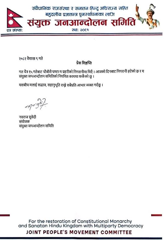 उनले विज्ञप्ति जारी गरी आफूकहाँ चैत १५ गतेदेखि राखिएको प्रहरी निगरानी हटेको बताएका हुन्।