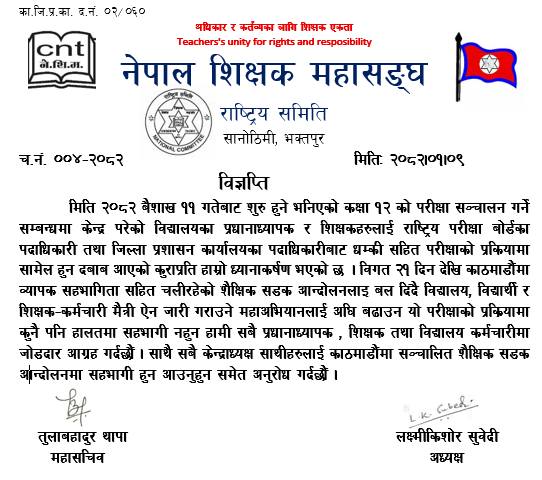 तर महासंघले भने कुनै पनि हालतमा कक्षा १२ को परीक्षा प्रक्रियामा सामेल नहुन प्रधानाध्यापक र शिक्षकहरूलाई आग्रह गर्दै आएको छ ।