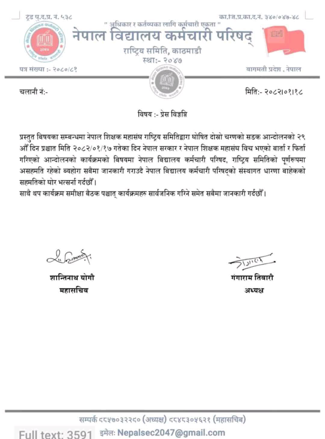 नेपाल सरकार र नेपाल शिक्षक महासंघबीच भएको वार्ता र फिर्ता गरिएको आन्दोलनको कार्यक्रमको विषयमा नेपाल विद्यालय कर्मचारी परिषद, राष्ट्रिय समितिको पूर्णरूपमा असहमति रहेको ब्यहोरा सबैमा जानकारी गराउँदै नेपाल विद्यालय कर्मचारी परिषदको संस्थागत धारणा बाहेकको सहमतिको घोर भर्त्सना गर्दछौं,विज्ञप्तीमा भनिएको छ।