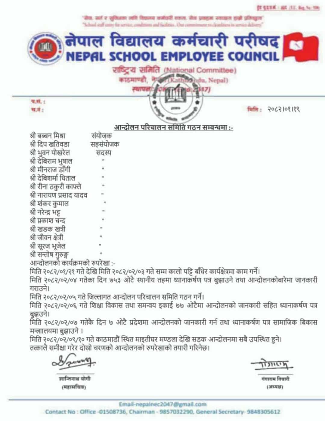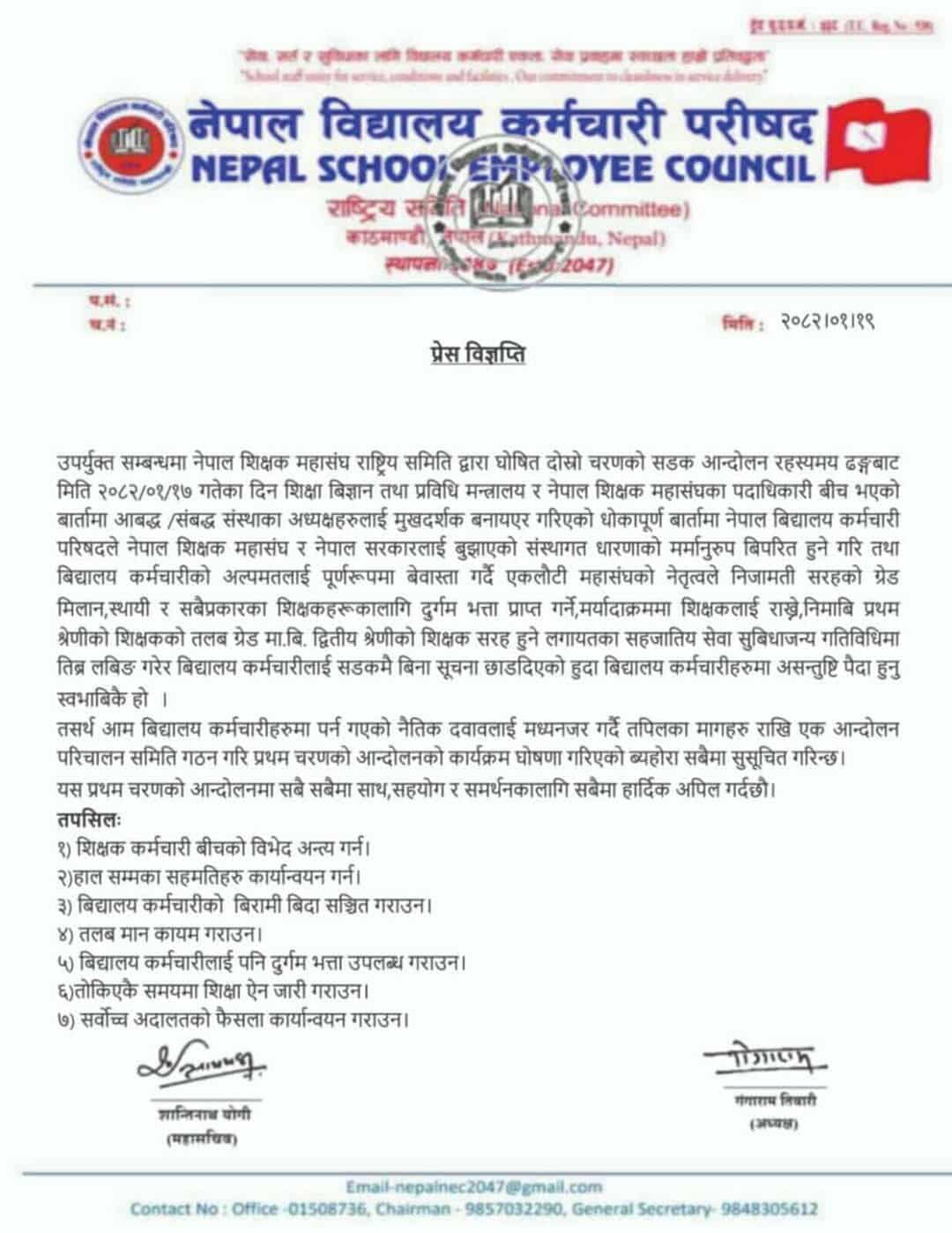 सरकारसँग भएको ९ बुँदे सहमतिप्रति असहमति जनाउँदै विद्यालय कर्मचारीहरूले कक्षा १२ को परीक्षा अवधिबारे कालो पट्टी बाँधेर विद्यालयको नियमित काममा सहभागी हुने भएका छन् ।