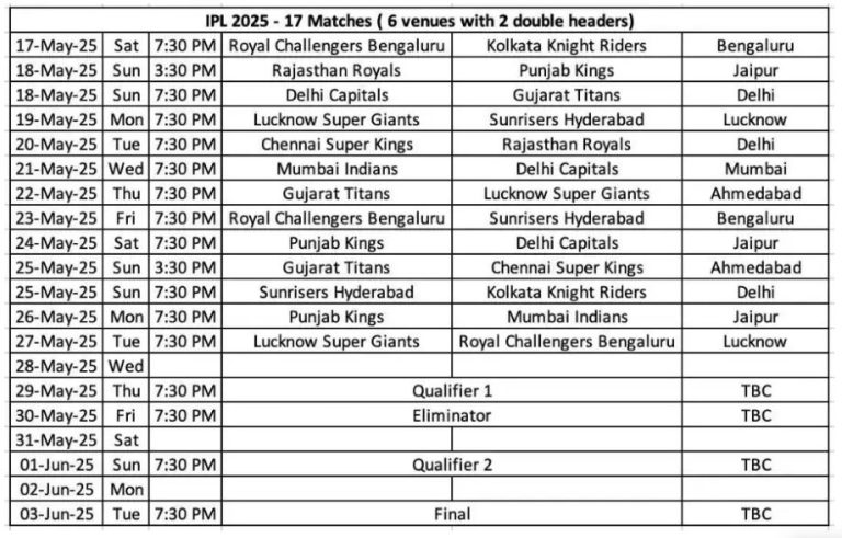 यसैगरी आईपीएलले भनेको छ, ‘बाँकी कुल १७ खेल ६ स्थानमा खेलिनेछन् । बाँकी खेल १७ मे २०२५ बाट सुरु भएर ३ जुन २०२५ मा फाइनलसँगै समाप्त हुनेछन् । नयाँ तालिकामा समावेश डबल–हेडर खेल आइतबारको दिन खेलाइने छ ।