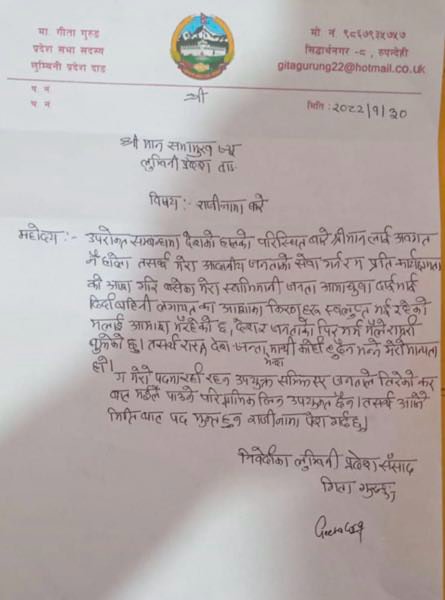 दाङ । लुम्बिनी प्रदेशसभाकी सांसद गीता गुरुङले पदबाट राजीनामा दिएकी छन् । गीता सीके राउत नेतृत्वको जनमत पार्टीकी समानुपातिक सांसद हुन्।लुम्बिनीका सभामुखसमक्ष मंगलबार उनले बुझाएको राजीनामामा देश र जनताको पीर मर्का आफूले राम्ररी बुझेको तर राष्ट्र र जनताभन्दा माथि केही हुँदैन भन्ने मान्यता रहेको उल्लेख गरेकी छन् ।