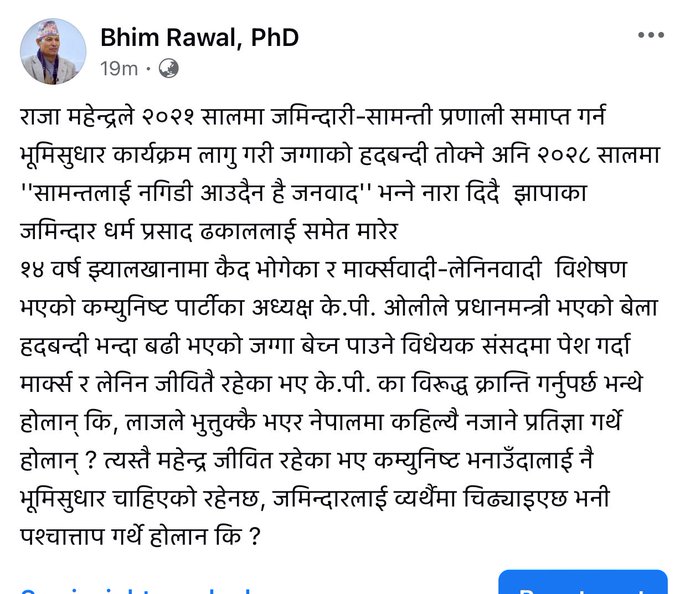 उनले लेखेका छन्,” १४ वर्ष झ्यालखानामा कैद भोगेका मार्क्सवादी लेनिनवादी विशेषण भएका कम्युनिस्ट पार्टीका अध्यक्ष केपी शर्मा ओलीले प्रधानमन्त्री भएको बेला हदबन्दी भन्दा बढी भएको जग्गा बेच्न मिल्ने विधेयक संसद्मा पेस गर्दा मार्क्स र लेनिन जीवितै रहेका भए केपी का विरुद्ध क्रान्ति गर्नु पर्छ भन्थे होलान् कि लाजले भुतुक्कै भएर नेपाल कहिल्यै नजाने प्रतिज्ञा गर्थे होलान् ?” भन्दै प्रश्न गरेका छन् ।