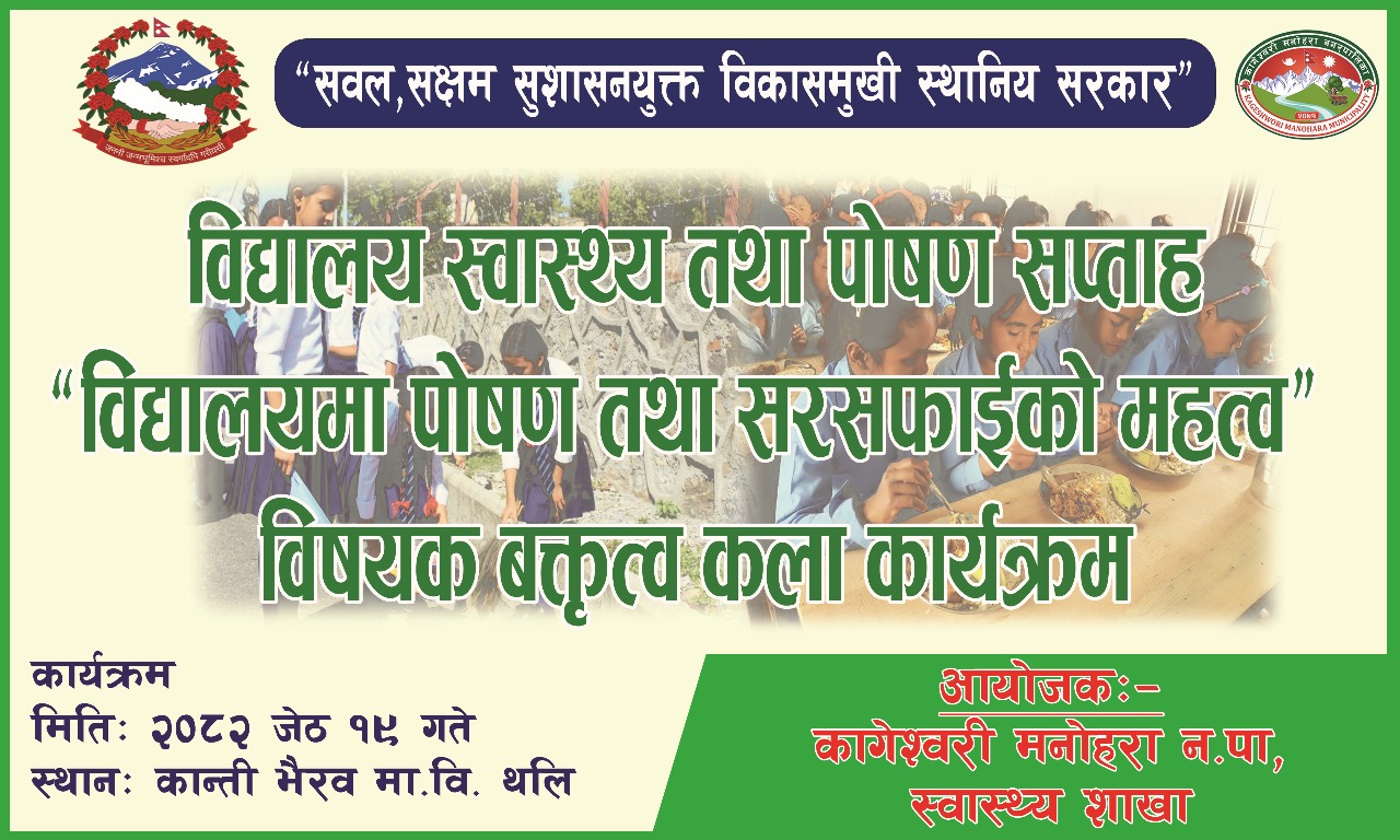 काठमाडौं, जेठ १९- कागेश्वरी मनोहरा नगरपालिकाको स्वास्थ्य शाखाले आयोजना गरेको “विद्यालयमा पोषण तथा सरसफाइको महत्व” बिषयक वकृत्वकलामा श्री बाल उद्धार माविकी यान्सु तामाङ प्रथम भएकी छन् ।